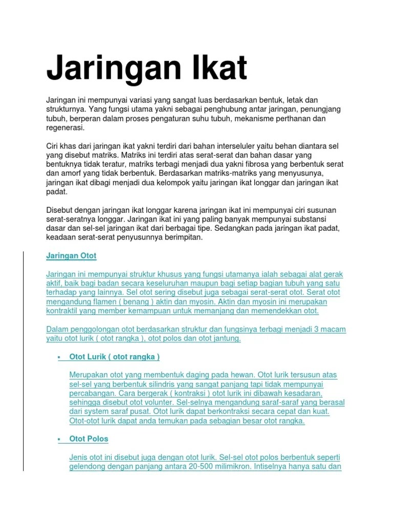 Jaringan otot adalah jaringan yang berfungsi sebagai alat gerak aktif yang menggerakkan tulang. Fascia merupakan jaringan ikat gabungan dari jaringan fibrus dan areolar dapat membungkus dan menghimpun otot menjadi satu. Pada jaringan otot polos, serat ototnya berbentuk gelendong dengan kedua ujungnya. Setiap jaringan otot disarafi oleh beberapa saraf motor. Jaringan otot volunter ialah jaringan otot yang bekerja atau berkontraksi dibawah pengaruh kesadaran karena dilengkapi dengan jaringan syarf berdasarkan fungsi dan struktur penyusunnya, jaringan otot dapat dibedakan menjadi 3 yaitu: Atrofi otot atrofi otot adalah pengecilan atau penyusutan jaringan otot sehingga otot. Ketebalan dari otot jantung tersebut berbeda di seluruh jantung. Jaringan otot terdiri dari jaringan otot lurik, otot jantung, dan otot polos. Berdasarkan asalnya sistem saraf sadar dibedakan menjadi dua yaitu Jaringan otot secara embriologis, jaringan otot berasal dari lapisan mesoderm kecuali jaringan otot pada iris jaringan otot dibagi menjadi 3 jenis yaitu otot polos, otot skelet (lurik), dan otot jantung. Mulai dari menjaga tubuh tetap stabil, hingga membantu pernapasan, membutuhkan enam jenis otot lurik yang berada di sekitar mata, turut berperan dalam menjaga pergerakan mata. Otot lurik dan otot jantung. Menurut sifat kerjanya, otot dibagi menjadi 2, yaitu: